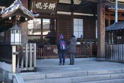 高輪中学校へのアクセスは、都営浅草線・京急線「泉岳寺」から徒歩3分。泉岳寺の山門を通り抜ける道程は、都会の喧騒を忘れさせてくれる落ち着きがあり、好天の陽射しとあいまったこの日は、まるで受験生を温かく向かい入れてくれるような和やかさがあります。集合まで余裕のある午後2時前には、本番前の「合格祈願」でしょうか。泉岳寺でお参りする受験生親子の姿も・・・。なかにはお弁当を食べて、入試に備える受験生も見受けられました。