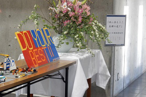 この日の午前入試の受験生集合時刻は8時15分。7時30頃から到着し始めた受験生の親子は正門を入って長い坂道と校舎に向かう階段を上って、右手の講堂に入っていきます。入り口では、係りの先生方と、きれいに飾られた生徒作品のレゴブロックや生花が受験生親子を迎えてくれます。