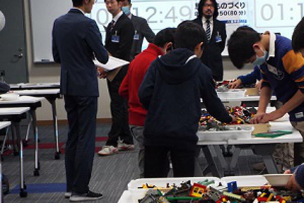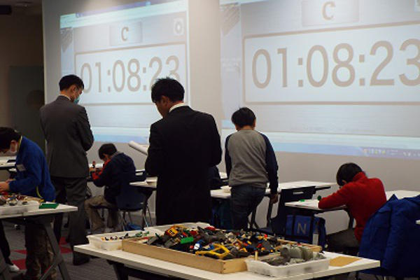 レゴブロックを取って自席に戻った受験生は、めいめい黙々と作品を作り始めます。その集中力とスピードに、初めてみる筆者は感心させられるほど。そして、ある程度まで作品ができると、おもむろに解答用紙に記述を始める受験生もいれば、作品を眺めながらしばし考えている様子の受験生もいて、ペース配分はさまざまです。