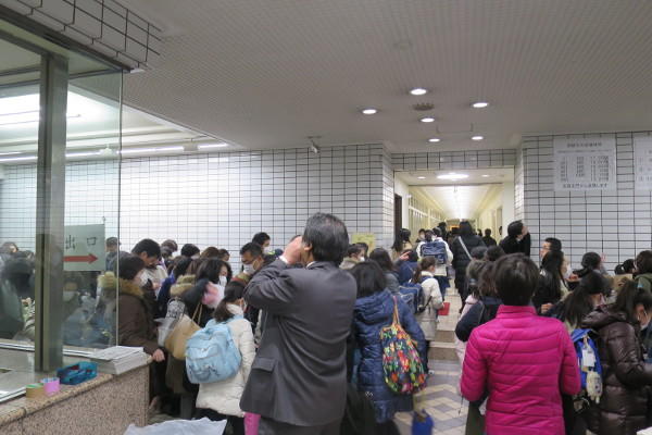 その後、受験生親子はほどなくして、受験生は試験会場へ、保護者は控え室などへと各々別れていきますが、先生方が誘導してくれます。 ここまで保護者と一緒に来られた安心感か、入試本番に慣れてきたのか、比較的あっさりと階段を上っていく受験生も見受けられました。 それでも保護者からは、「深呼吸よ!」「解答欄と問題の番号を間違えないようにね!」などと、さまざまな檄が飛びます。 この日具合が悪くなってしまい、階段で保護者と別れる前に保健室での受験を申し出ていた親子もいました。インフルエンザのため、別室受験をした受験生もいたそうです。