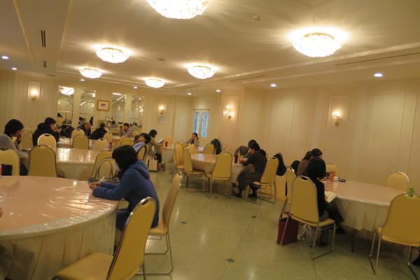 保護者の控え室は講堂のほか、ため息が出そうなほど美しいシャンデリアが飾られた螺旋階段のあるロビー部分など。飲食ができるのは趣のある試食室や食堂「ポッポ」といった、豊島岡生の生活の一部が垣間見えるような場所も用意されていました。 食堂の横には、その場で1杯ごとに豆を挽き、香り豊かなドリップコーヒーが楽しめるメーカーが置いてあり、ホッとひと息ついている保護者の姿も見られました。