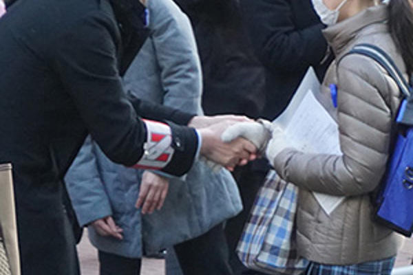 試験会場へ入場できるのは7:30。現地では7:15を過ぎた頃から、徐々に受験生が増え始め、校舎前では先生たちと握手を交わす姿が目立ち始めます。そんな受験生たちに大きな声で整列を促すのが、案内係を務めるJGの在校生たちです。「入場開始までこちらにお並びください」と憧れの先輩たちに声を掛けられると、受験生たちは少し緊張した面持ちながらも、素直に指示に従い、整列して入場の時間を待ちます。