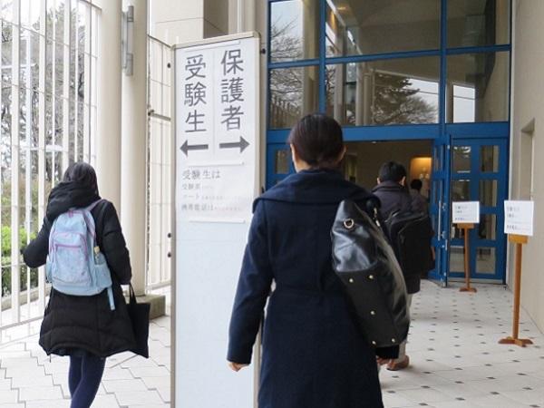 校門から校舎の中までは、受験生と保護者は一緒に入ることができます。ただし、ルートは分かれているので、「おっと」といった体で進行方向を変える保護者の姿も。また、「携帯電話の持ち込みは禁止です」という先生方からのアナウンスが響いており、慌てて携帯電話を保護者に渡す受験生もいました。