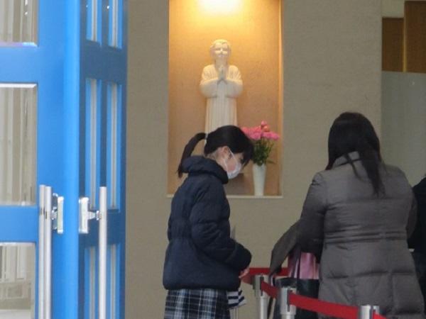 その後、受験生は入試会場へ、保護者は控室へ分かれていきますが、その手前で出迎えてくれるのは、やさしく聡明な顔つきが印象的な「幼きイエス」の像です。