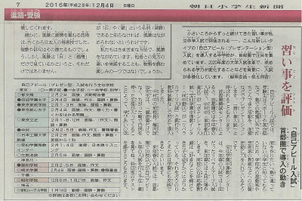 昨年12月4日(日)に朝日小学生新聞が記事で取り上げた「自己アピール(プレゼンテーション型)入試」も、今春2016年から中学入試に登場したユニークな新タイプの入試です。