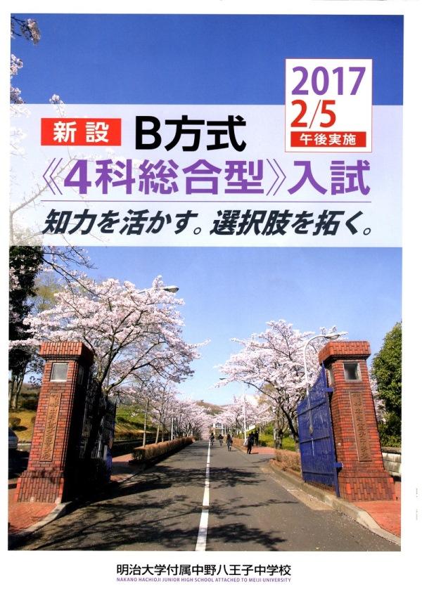 その先陣を切って、明治大学付属中野八王子中学校〈東京都八王子市。共学校〉が、2017年入試では、2月5日(日)午後に、「B方式《4科総合型》入試」を新設することを先に公表しました。
