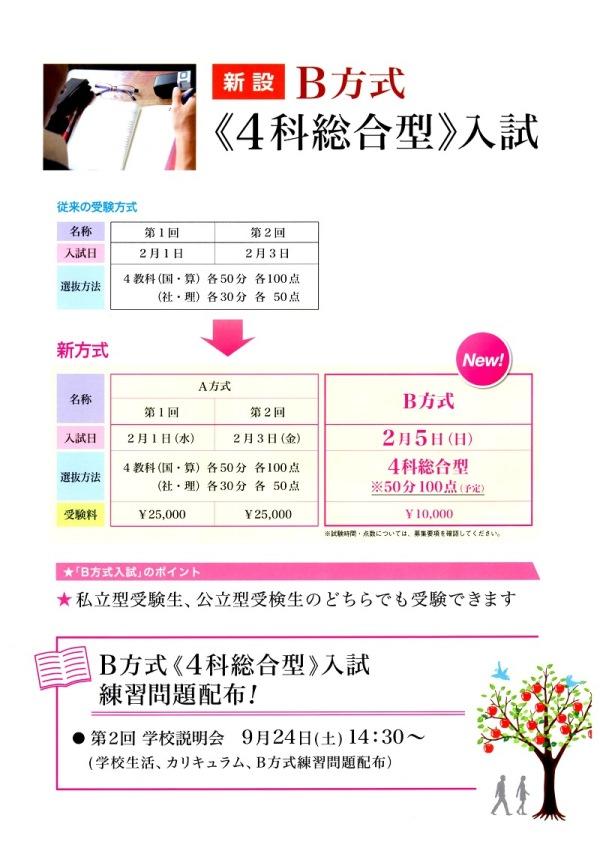 同校のWebサイトでは、4月21日に「2017(平成29)年中学・高校募集要項」と「平成29年度中学校入試 2月5日午後 B方式《4科総合型》入試 新設」が合わせて公表され、続く4月27日(水)には「中学校 B方式《4科総合型》入試のリーフレット(PDF)」がアップされています。