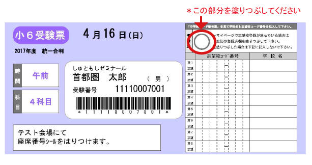 登録後は受験票「入力済」欄の○印を塗りつぶしてください。(図参照)