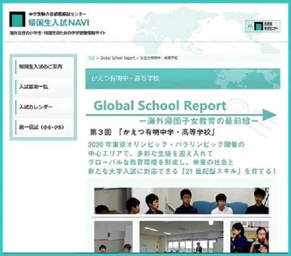 首都圏模試センターが2015年末から開設~運営している、海外在住の小学生と帰国生のための中学受験情報と帰国生受け入れ校の情報をお伝えするWebサイト『帰国生入試NAVI』サイトに、このほど新コーナー「Global School Report」が開設しました。