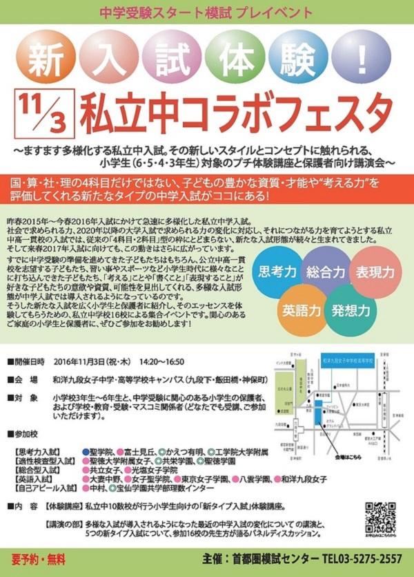 11月3日(祝・木)には、小6第5回「統一合判」模試の会場校のひとつでもある和洋九段女子中高キャンパスで午後から、中学入試に増えてきた新たなタイプの入試を知るための体験講座と講演によるイベント「新入試体験! 私立中コラボフェスタ」が開催されます。
