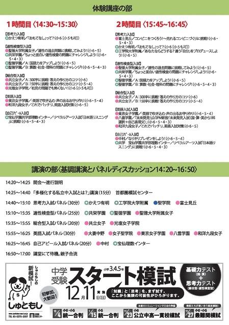 中学入試における「新タイプ入試」の体験講座は小6・小5・小4・小3の子どもたちを対象としたもので、1時間目〈14:30~15:30〉、2時間目〈15:45~16:45〉とも、60分間の時間のなかで、正味約45分~50分、各参加校の先生方が行う「新入試体験講座」を受講できます。