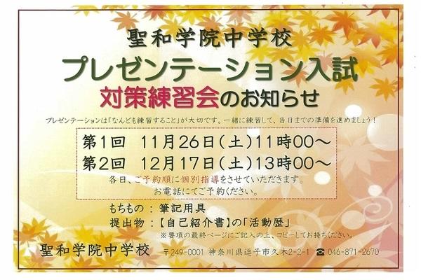 聖和学院中学校〈神奈川・逗子市。女子校〉では、11月26日(土)の11:00から、同中学校が来春2017年入試から導入する「プレゼンテーション入試」の対策練習会《第1回》を開催します。