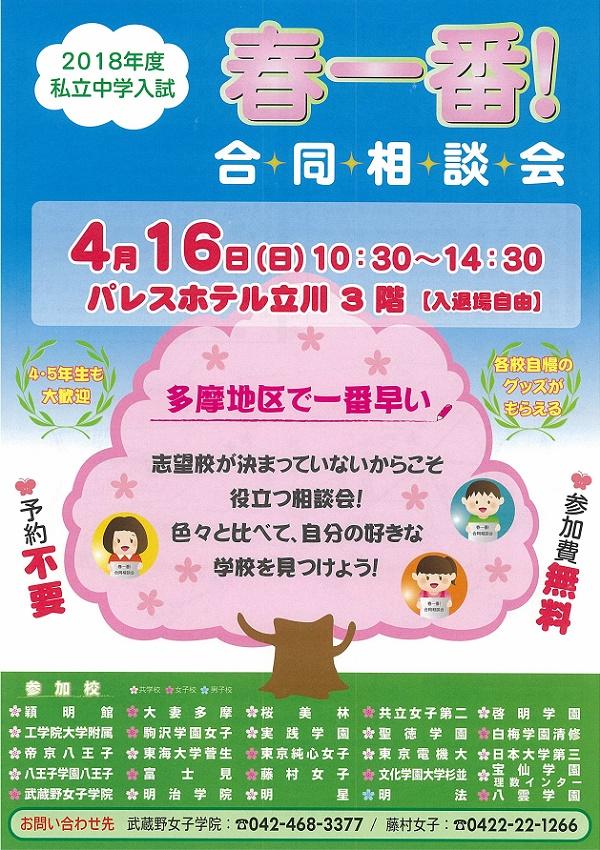 来春2018年入試に向けて、首都圏模試センターの小6第1回「統一合判模試」が行われる4月16日(日)、立川パレスホテルにて10:30~14:30の時間帯に、多摩地区を中心にした私立中学校25校が集まって行う‟多摩地区で一番早い‟合同相談会『春一番!』が開催されます。