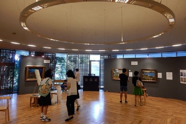 展示会場は、“自然とゆとりの100年建築”がテーマの校舎の奥にある生徒ラウンジや、広々とした廊下、ふだんは聖堂として使われる円形の多目的スペースであるアデルホール。すべてが広々とした贅沢な造りで、大きく開けた窓と白木を基調とした室内には光が差し込み、心の声に耳を傾ける聖堂には落ち着きを…、といったミッションスクールならではの独特厳かな雰囲気に、ゆとりをもって名画が展示されています。