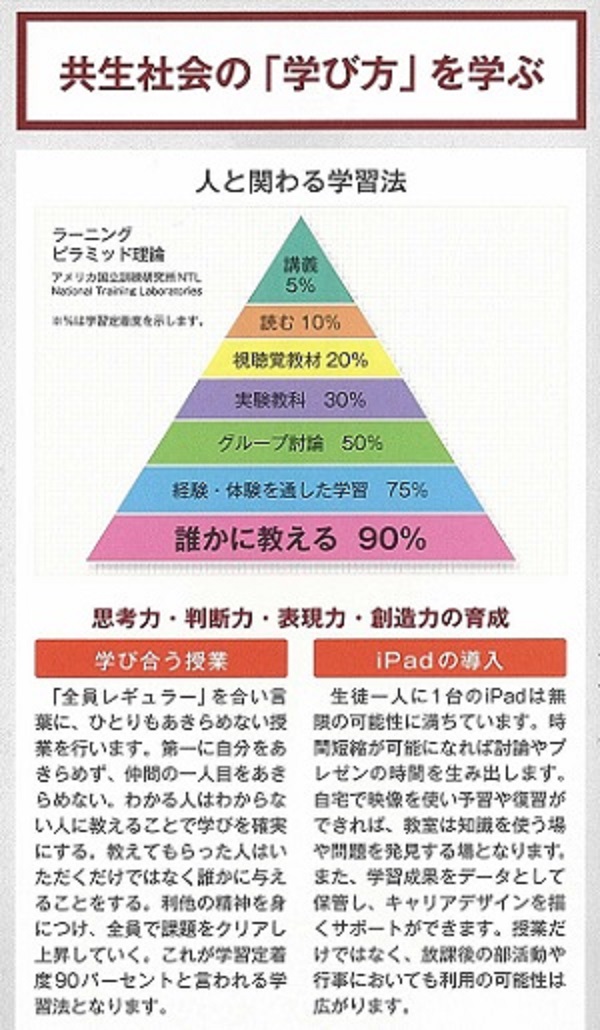 最初の「共生社会の『学び方』を学ぶ」では、アメリカで開発・提唱されてきた「ラーニングピラミッド理論」の考え方をもとに、「人と関わる学習法」を通して、この先5年後の「2020年大学入試改革」で導入される新テスト制度で問われる「思考力・判断力・表現力」そして「想像力」の育成をめざします。