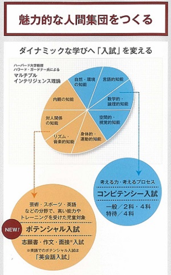 これまでの入試では、8つの知能のうち「言語的知能」「数学的・論理的知能」「自然・環境の知能」「空間的・視覚的知能」に重点が置かれてきたことを踏まえ、その部分は大切にしつつ、もう一方で、その「マルチプル・インテリジェンス(=8つの知能)」の「身体的・運動的知能」「リズム・音楽的知能」「対人関係の知能」「内観の知能」にも着目した「ポテンシャル入試」を新たに導入し、芸術・スポーツ・英語などの分野で、高い能力やトレーニングを受けた児童を迎え入れ、新たな教育空間を創造していこうとしています。
