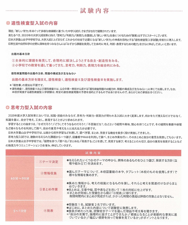日本大学豊山女子中学校では,大学入試にとどまらず,これからの社会で必要になる「新しい学力」の伸長を目的とする「適性検査型入学試験」を新たに導入します。