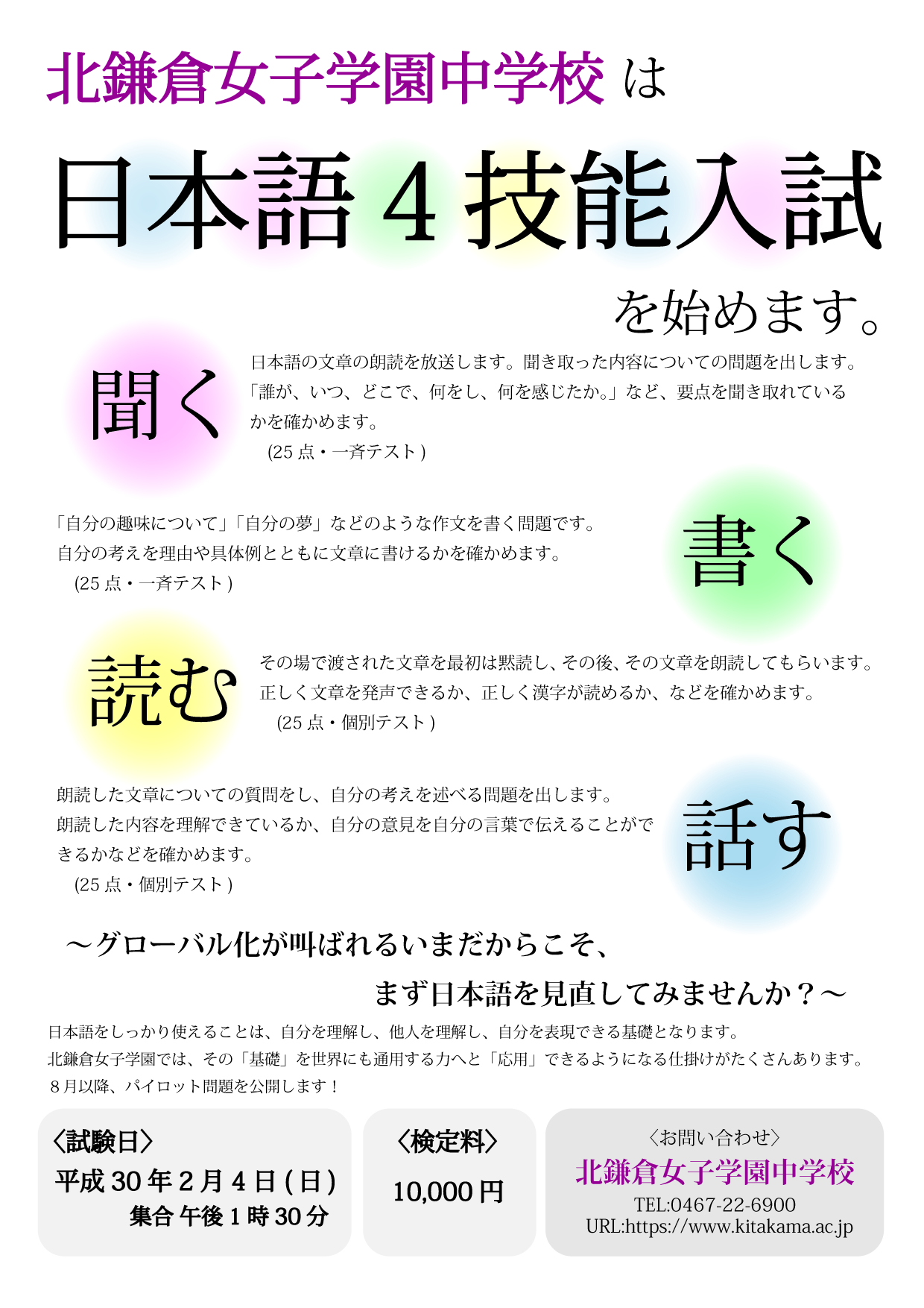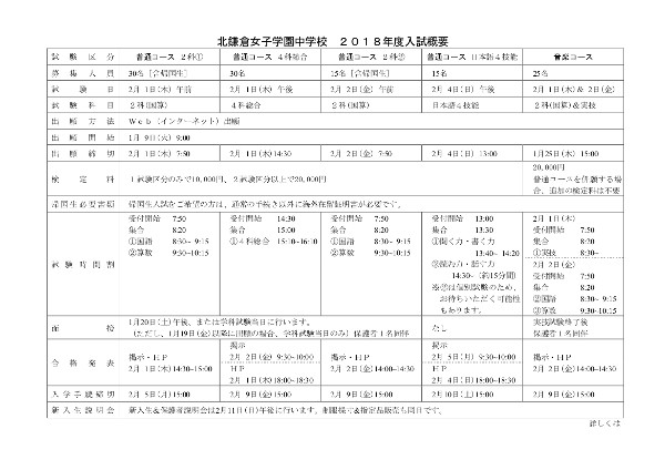 くわしくは北鎌倉学園女子HP「2018年度中学入試日程等決定!「日本語4技能入試」をはじめます!」か下記PDFをご確認ください。