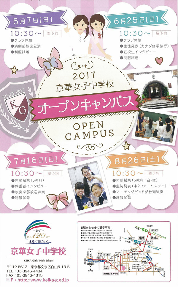 中学では4回目、高校では2回目となるオープンキャンパスを8月26日(土)に開く京華女子中学・高等学校<文京区・白山>。全国大会で3年連続金賞を受賞したマーチングバンド部による歓迎演奏を聞いた後、授業体験や生徒発表を聞くことが出来ます。