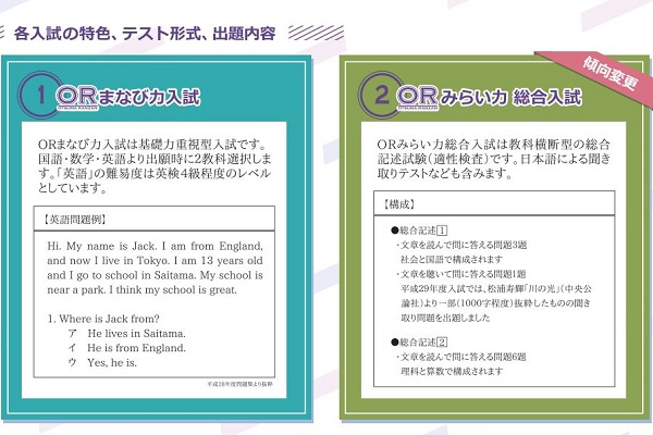 2017年に新設したORみらい力入試ですが、2018年入試ではさらに多様化し受験生の選択肢が増えます。総合入試(1/11AM)では総合記述試験(適性検査)で教科の垣根を越えた横断的な力を問います。出題内容は、社会と国語で構成された総合記述1と理科と算数で構成された総合記述2、また総合記述1では日本語による聞き取りテストも含まれています。公立中高一貫校を目指す受検生にも対応した入試といえるでしょう。