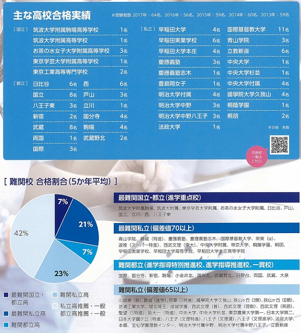 たとえば最近5年間の累計で、筑波大学附属駒場(1名)、筑波大附属(1名)、東京学芸大学附属(1名)、お茶の水女子大学附属(3名)、日比谷(6名)、戸山(3名)、国立(8名)、立川、(1名)、西(6名)、八王子東(3名)などの「最難関国立・都立(進学重点校)」高校に累計で33名が合格しています。私立高校では、青山学院(3名)、錦城・特進(28名)、慶應義塾(3名)、慶應義塾志木(1名)、国際基督教大学(11名)、栄東・α(3名)、淑徳・スーパー特進(3名)、城北(1名)、西武文理・東大(15名)、中央大学附属(4名)、帝京大学(6名)、桐蔭学園(1名)、桐朋(2名)、豊島岡(1名)、明治大学付属明治(4名)、早稲田実業学校(6名)、早稲田大学高等学院(4名)、早稲田大学本庄高等学院(4名)などの「最難関私立(偏差値70以上)」高校に累計で100名が合格しているという、高校進学実績の良さには目を見張らされます。そのほかにも、国際(3名)、国分寺(4名)、新宿(2名)、駒場(4名)、小金井北(1名)、調布北(4名)、武蔵野北(2名)、日野台(2名)、両国(1名)、武蔵(8名)、大泉(1名)などの「難関都立(進学指導特別推進校、進学指導推進校、一貫校)」高校に累計で32名、ほかの「難関私立(偏差値65以上)」高校に累計111名が合格しています。この成果は間違いなく、熱意ある教師陣の面倒見と工夫された教育展開、意欲ある生徒たちの努力によるものに他ならないでしょう。