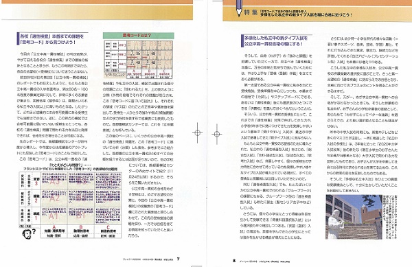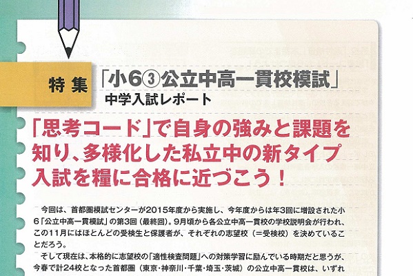 その模試の受験生全員にお持ち帰りいただいた「解答と解説」冊子の巻頭に掲載した「中学入試レポート」では、今回の受検生の成績表にも反映されている、首都圏模試センターの「思考コード」による、公立中高一貫校の「適性検査」問題の分析(分類)を、東京都立の4校(小石川・両国・武蔵・桜修館)と神奈川・横浜市立の2校(市立南高等学校附属・市立横浜サイエンスフロンティア高等学校附属)について、サンプルとしてご紹介しました。