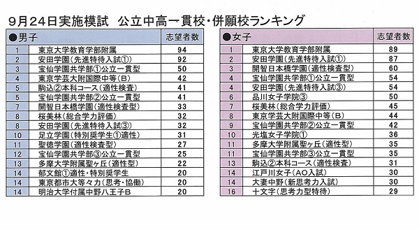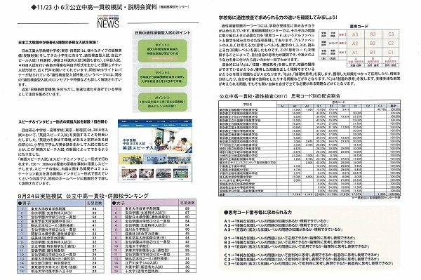 この資料の表面には、そうした私立中学校の新タイプ入試の例と、前回9月24日(日)に実施された小6第2回「公立中高一貫校模試」の受検生が実際に志望校登録した私立・国立中入試の男子・女子別の「志望者数ベスト16」の表、そして首都圏模試の「思考コード」で見る公立中高一貫校の「適性検査」の配点割合(一部配点は首都圏模試センター予想)などをご紹介しています。