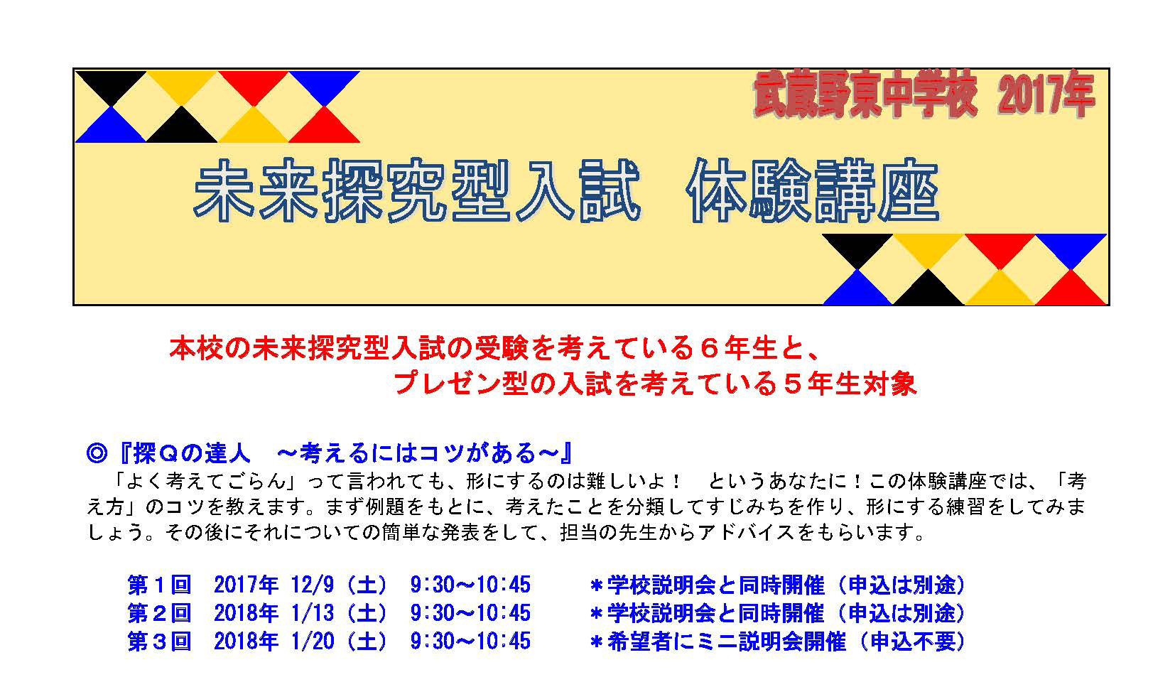 第1回・2回については学校説明会も同時開催(申込は別途)。第3回(1/20)は希望者を対象にミニ説明会が実施されます(申込不要)。