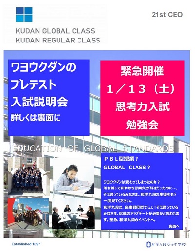 和洋九段女子中学校が12月17日(日)にプレテスト、年明けの1月13日(土)に思考力入試勉強会を開催します。