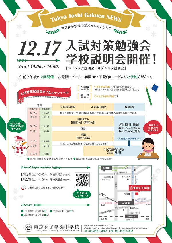 東京女子学園中学校〈東京・港区。女子校〉では、12月17日(日)に午前(10:00~)と午後(14:00~)の2回、「入試対策勉強会・学校説明会」を開催します。小6対象で、2科目・4科目どちらかを選択しての模擬テストと解説が体験~受講でき、その間、保護者向けにも解説と説明会が行われます。