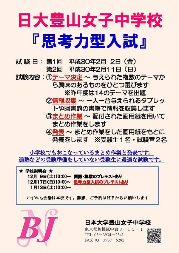 日本大学豊山女子中学校〈東京・板橋区。女子校〉では、12月17日(日)10時から、年内最後の学校説明会を実施します。そこでは、同校が2017年入試から導入している「思考力型入試」のプレテストも行われます。同中学校の「思考力型入試」は、来春2018年入試では、①2月2日(金)午後(15:30~)と、②2月11日(日)午前(8:30~)の2回実施されます。