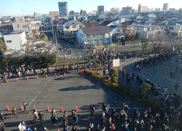 朝の段階ではこの日の実受験者数は不明ですが、仮に約6,400名の受験生が一人の保護者の付き添いで来校したと数えても、1万3,000名近くの親子がこの日に訪れたことになり、これに応援の塾関係者や取材陣を含めると、およそ1万4,000名がこの栄東中A日程入試のために来校したことになります。