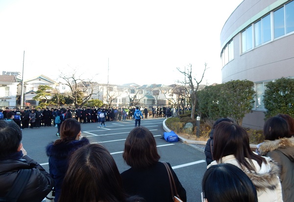 正門から正面の校舎前の広場を右手前から左手奥に半周する形で移動する間に、多くの受験生の親子は、受験票などの持ち物をあらためて確認しています。親と子の分岐点から先、受験生は左手に進み、保護者は右手の体育館が待合室のため、ここでしばしのお別れです。