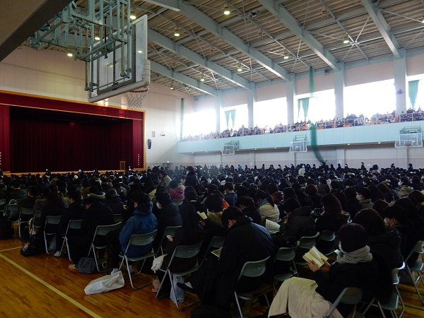 受験生と別れた保護者の多くは、控室となっている大きな体育館(大講堂)に入っていきます。8時30分頃には、2階の体育館フロアはほぼ満席で、スタンド席に加えて例年よりも多くのパイプ椅子が通路にも並べられた2階の観覧席も、すでに多くの保護者で埋まっていました。