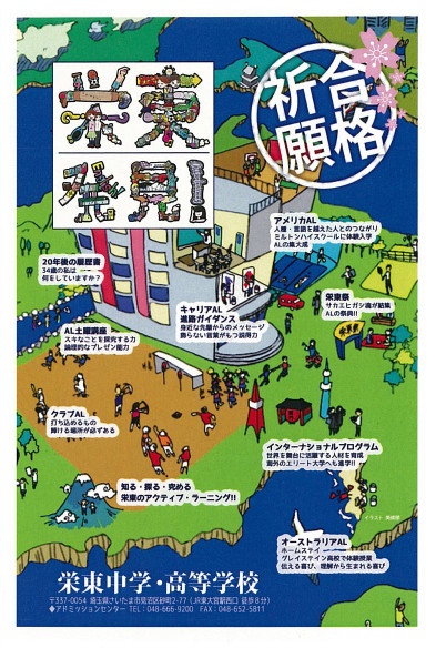 写真は、今春の年賀で同校から首都圏模試センターにもお送りいただいた年賀状ですが、学校生活のあらゆる場面をアクティブラーニングと位置付けた同校の教育姿勢とメッセージがイラスト図解に込められたものです。