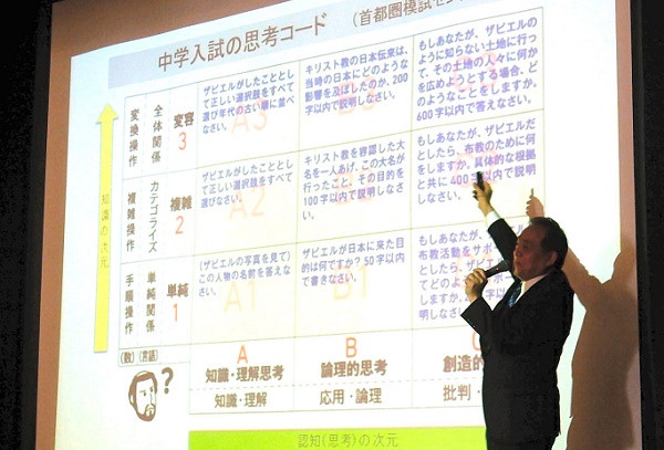 続いて、そうした現在~今後の日本の学校に求められる教育のあり方を読み解き、いまの子どもたちにとって望ましい教育を自ら模索し形作ろうとしている私立中高一貫校の先生のお一人であり、同時に、日本の教育改革に関わるキーマンのお一人として、今回の模試会場となった順天中高校長の長塚篤夫先生が、約75分にわたり保護者に向けた丁寧な解説をしてくださいました。長塚先生がリーダーシップをとる順天中学・高等学校は、やはり「21世紀型教育機構」の当初からの加盟校でもあります。