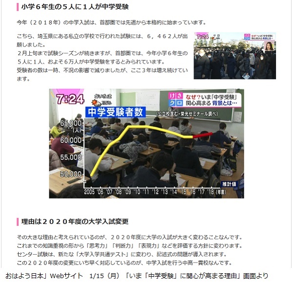 折しもこの翌日1月15日(月)早朝のNKH「おはよう日本」では、変わる大学入試と、その変化を先取りした中学入試について紹介。聖学院中の思考力入試(思考力セミナー)、宝仙学園共学部理数インターのアクティブラーニング型入試などの様子が取材レポートで伝えられました。
