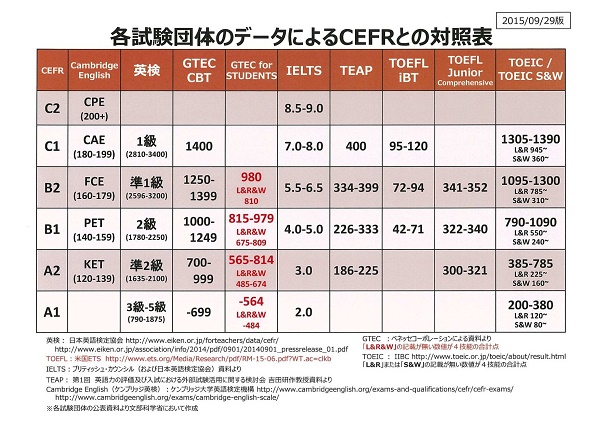 表は、文部科学省のWebサイトにも紹介されている「CEFR(セファール=)」の基準にあてはめた換算表ですが、たとえばこの表で見れば、今後の大学入試では最低でも「B1」レベルの英語力が求められる入試にすることを文科省は目安に掲げており、一方では、この方針を受けて、さらに高い「B2」、「C1」レベルの英語力の育成をめざすと明言する私立中高一貫校も登場しています。