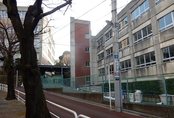 わが子を見送った保護者は、そのまま左手の通用口から脇道に出て、いったん帰路につくか、もしくは保護者控え室となっている、高校校舎の裏手にある中学校舎の中講堂・視聴覚室へと向かっていきます。