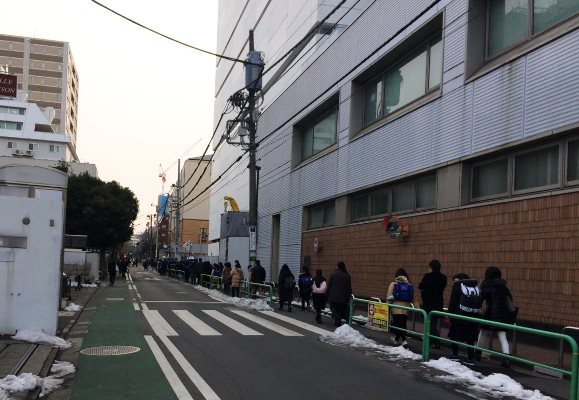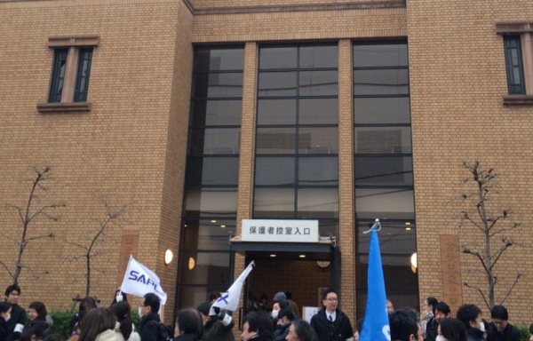 報道陣・塾の先生・保護者がごった返す中。いよいよ入場開始です。この頃には受験者の来場もピークを迎えますが、案内係(在校生)の的確な誘導により、受付もスムーズに進みます。