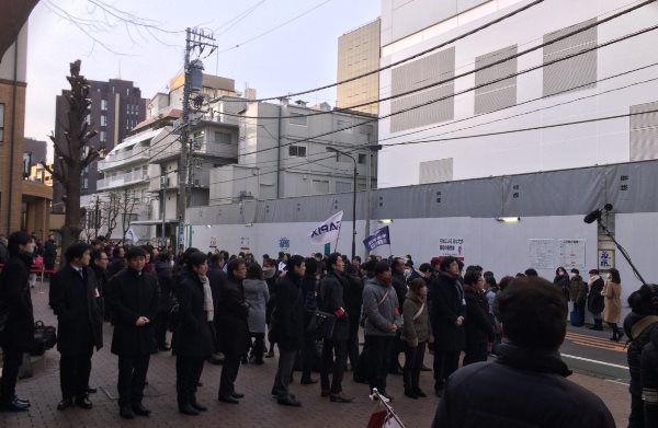 受験生たちを激励するため、レンガ調の外壁が印象的な女子学院の校舎前には、7:00頃からすでに各塾の先生方がスタンバイ完了。さすがに名門女子校とあって報道関係の取材陣も受験生たちの到着を待ち構えます。