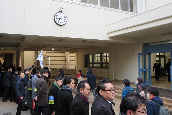 麻布の入学試験は14時30分まで続く長丁場の試験としても有名です。試験に向かう子供たちの背中を見送った後は、すぐに帰路につく保護者もいれば、控え室である講堂で試験が終わるのを待つ保護者もいました。