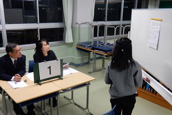 それぞれ2人ずつ、机を挟んで発表を聞く先生方は、にこやかに受験生の発表を聞き、その発表に込められた受験生の考えや想いを温かく受け止めてくれている様子です。発表が終わると受験生に着席させてから、発表についての質問や声かけをしてくれます。