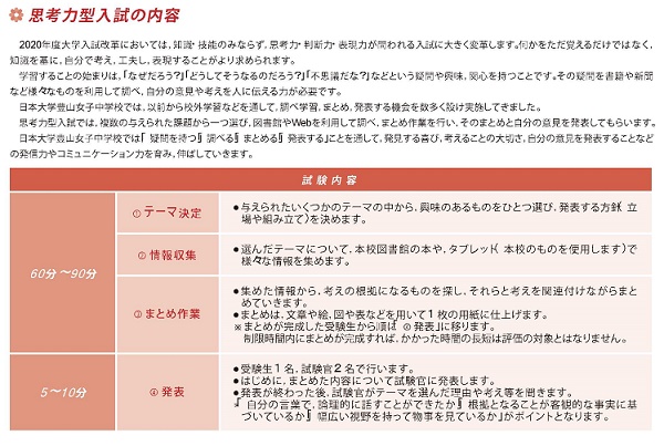 この日大豊山女子中の「思考力型入試」の内容やコンセプトは同校Webサイトの「中学校入試情報」→「入学試験要項」のページに詳しく紹介されています。「思考力型入試の内容」としては、下記のように掲載されています。
