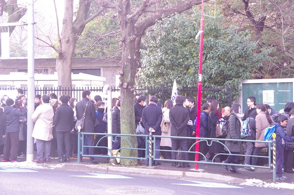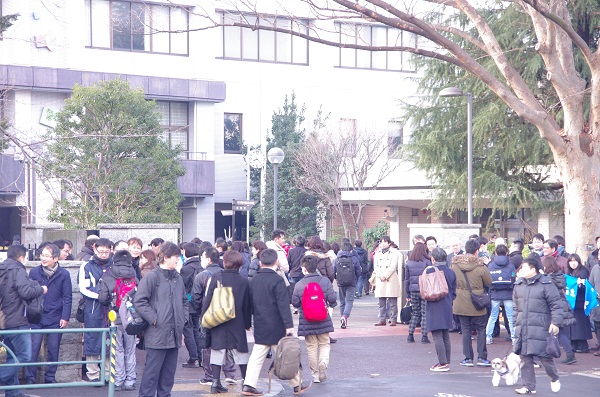 試験当日は前日の雪模様とは打って変わって、晴天に恵まれました。最寄りの駒場東大前駅には7時30分を過ぎると多くの受験生親子の姿が見られました。学校へ向かう道中にも応援の塾の先生の姿が、またある塾は学校付近の公園で激励を行っていました。