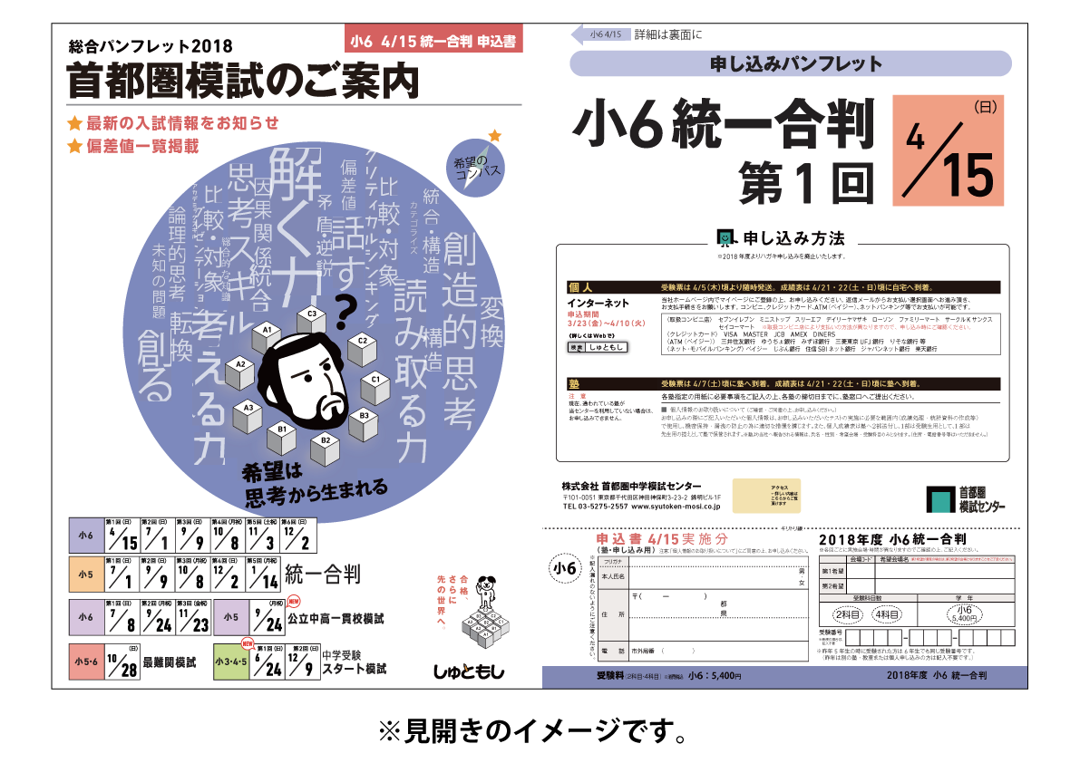 統一合判のパンフレットは小6と小5が一体化になり、模試の概要や入試情報も掲載した冊子になります。また、複数の実施日の申込書をまとめた形式になります。詳細はPDFファイルをご確認ください。