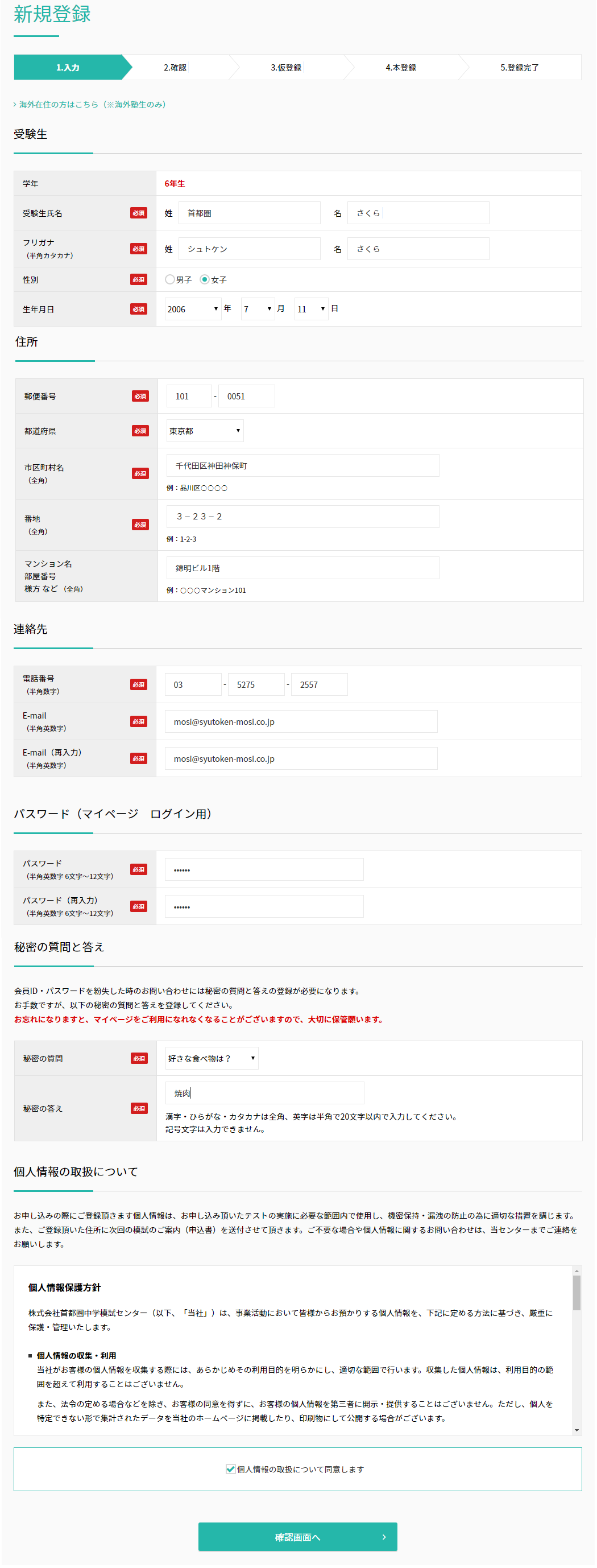 [新規登録]より必要事項を入力し個人情報の取扱いにチェックを入れたら[確認画面へ]をクリック。