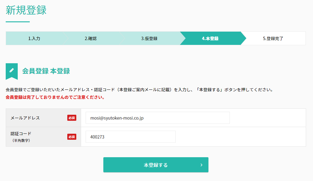 [会員登録 本登録]で登録したメールアドレスと認証コードを入力して[本登録をする]をクリック。