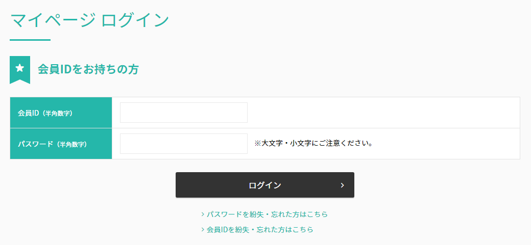 マイページログインページの[会員IDをお持ちの方]で「会員ID」と「パスワード」を入力の上ログイン。