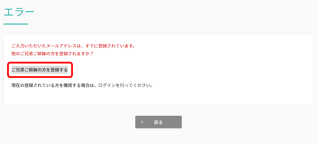 ご兄弟ご姉妹を登録する場合、同じメールアドレスのためエラー画面が表示されますが[ご兄弟ご姉妹の方を登録する]をクリックしてそのまま進んでください。